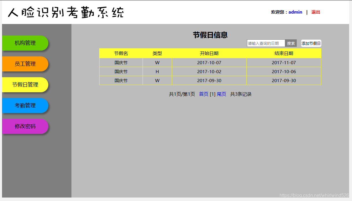19. 点击【节假日管理】,进入节假日页面。该页面可添加节假日和搜索日期。如下图: