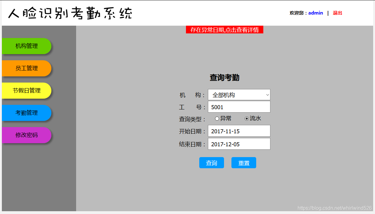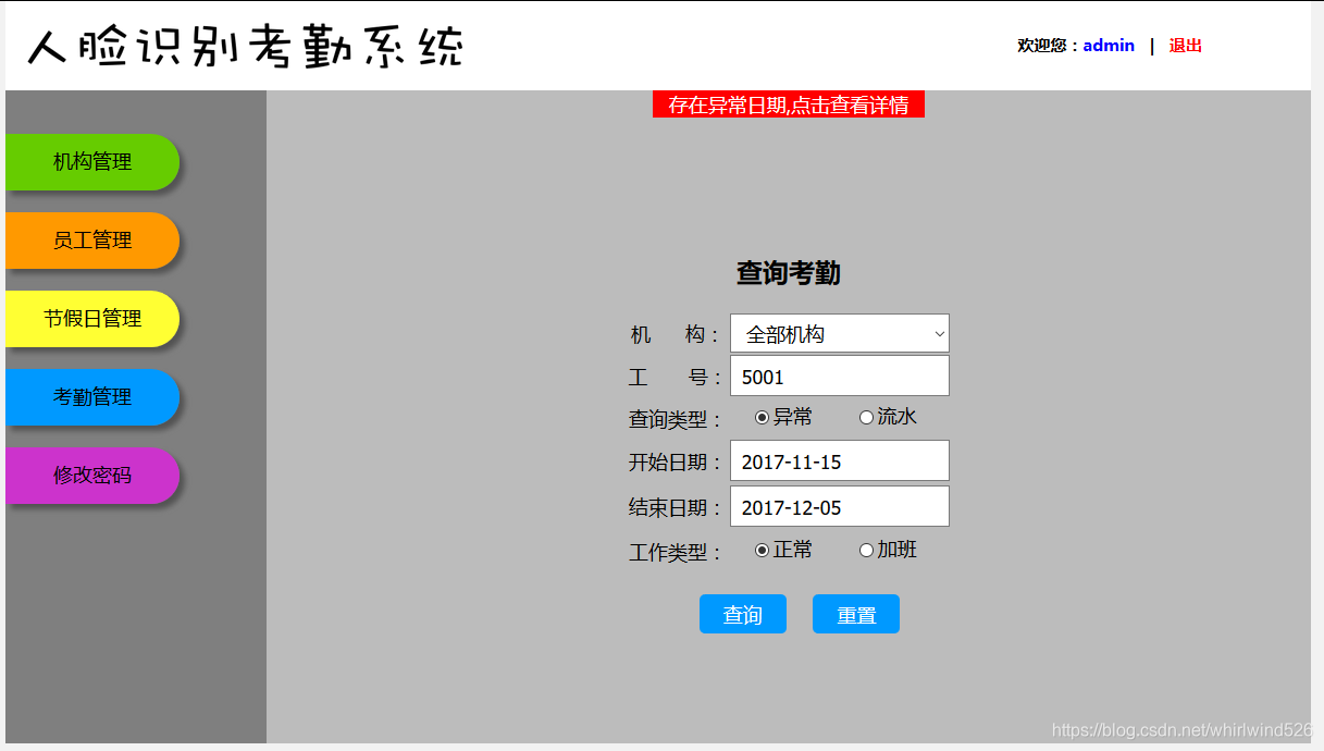 24. 若根据文本框提示输入信息,选择异常,点击【查询】按钮。进入异常的考勤统计页面。如下图: