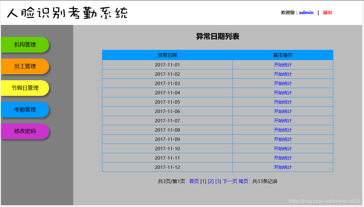 23. 点击【存在异常日期,点击查看详情】,进入异常日期页面。点击【开始统计】,则服务器会跑当前的日期的考勤。如下图: