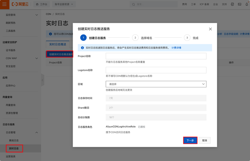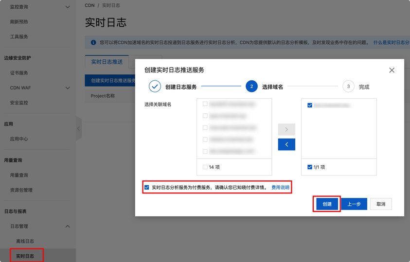 登录CDN控制台,在左侧导航栏,单击日志管理 > 实时日志,在实时日志推送页签,创建实时日志推送服务,选择需要开启实时日志的域名后创建。