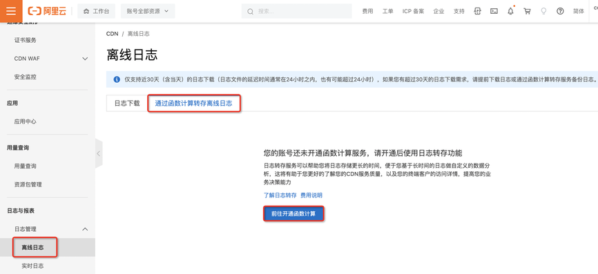- 在离线日志-通过函数计算转存离线日志中,前往开通函数计算产品