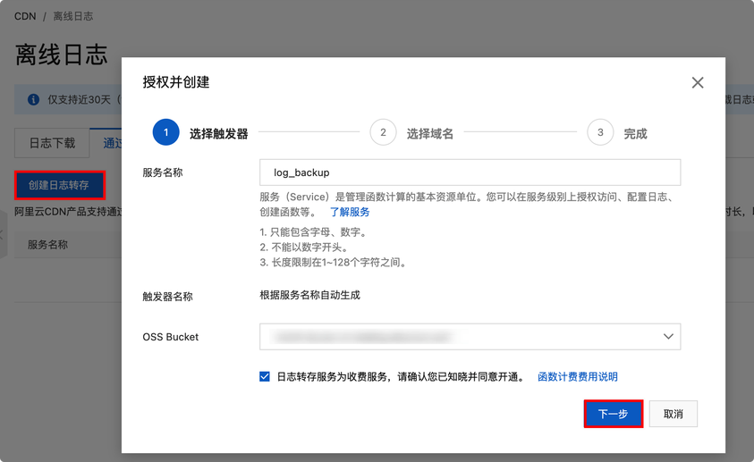- 创建完成,当域名产生新的日志后,会通过触发器将日志存储到OSS空间。