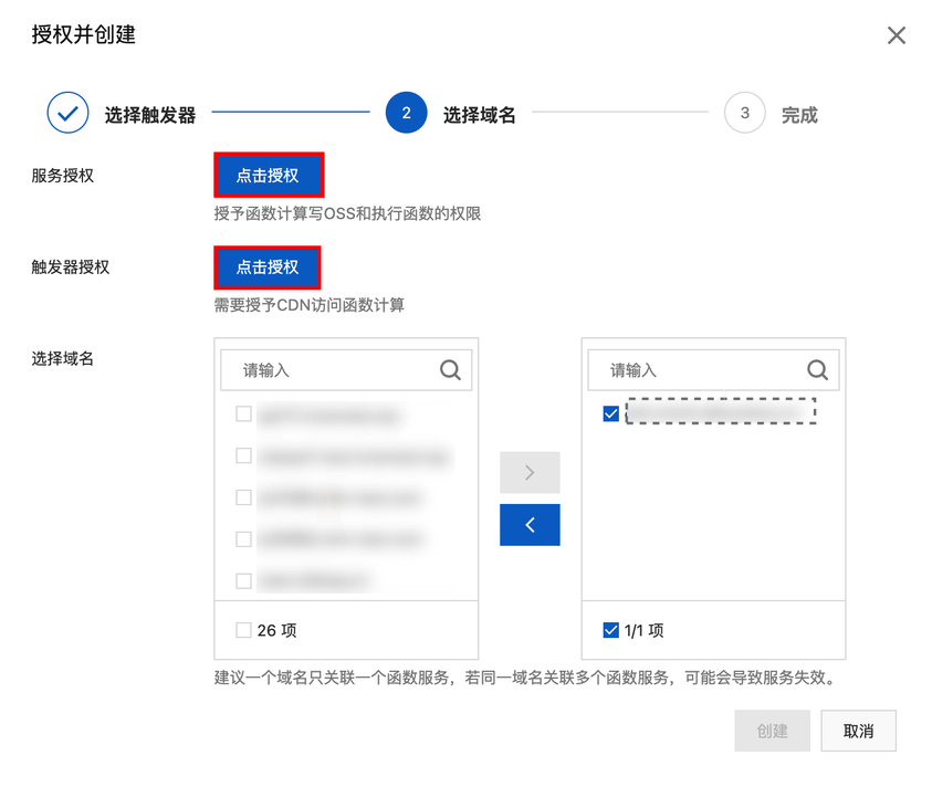 - 点击按钮进行授权,选择需要关联函数服务的域名。