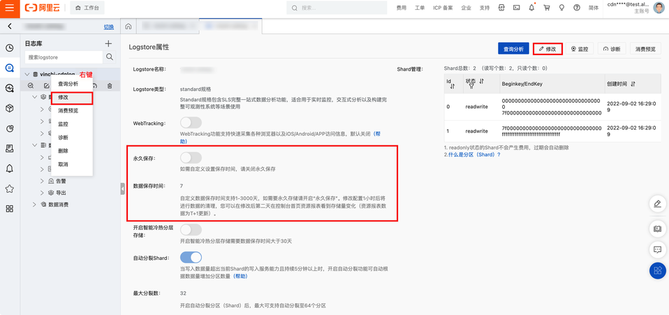 - 右键需要修改Logstore打开修改面板,点击修改按钮后对保存时间进行调整,如需永久保存可开启永久保存开关。