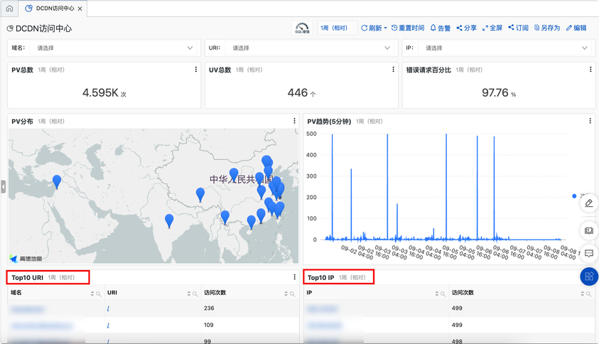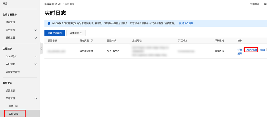 创建投递项目后,点击对应的分析与告警,可以跳转DCDN访问中心查看报表,报表业务默认展示了常见图表,您也可以根据业务需求创建自定义图表。