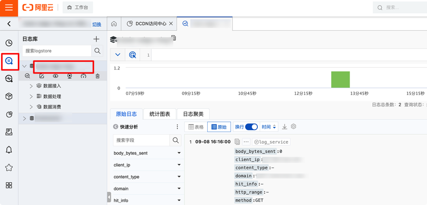 左侧导航栏可以切换日志存储,点击Logstore名称打开日志分析页面。