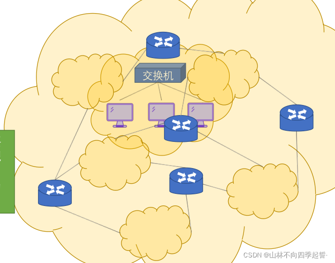 - 边缘部分:端系统,用户可以直接使用 B/S方式,C/S方式,P2P方式。端系统之间的通信是进程之间的通信,需要两边都打开QQ这个功能。P2P方式就是端系统既可以当服务器,也可以当客户端,B/S方式的弊端就是会导致服务器速度下降。