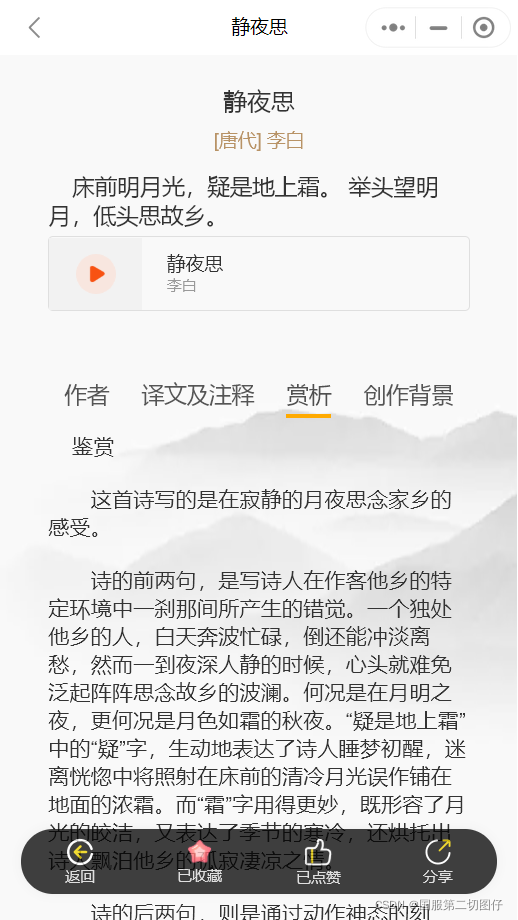 04、点击诗词后,可以看到诗词的详细内容,包含诗词的内容,诗词的注释,翻译,赏析,创作背景等。同时如果喜欢这首诗词的话,还可以将诗词收藏,收藏后可以在我的里面“诗词收藏里面。