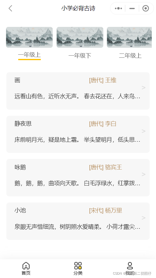 本次设计的作品为诗词学习助手,为了推广中国古诗文化,从而设计的一款小程序。