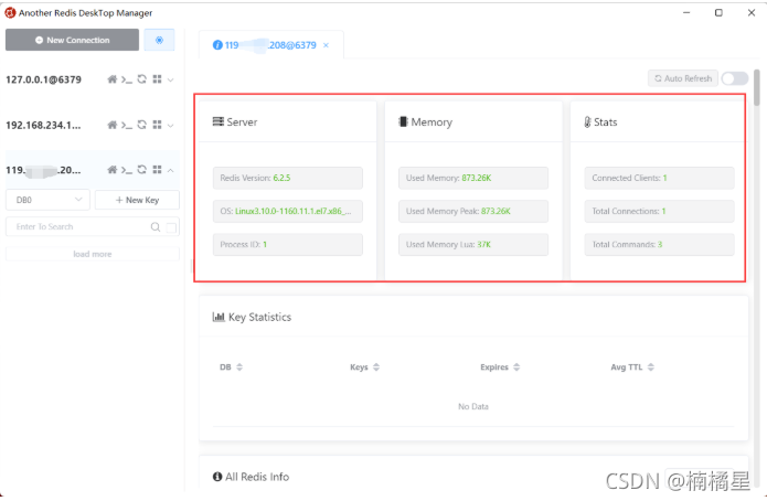 我们host填写我们的ip地址,服务器要去放行6379端口。由于没有设置密码,我们只需要填写ip和端口即可,端口我们使用的默认的6379。