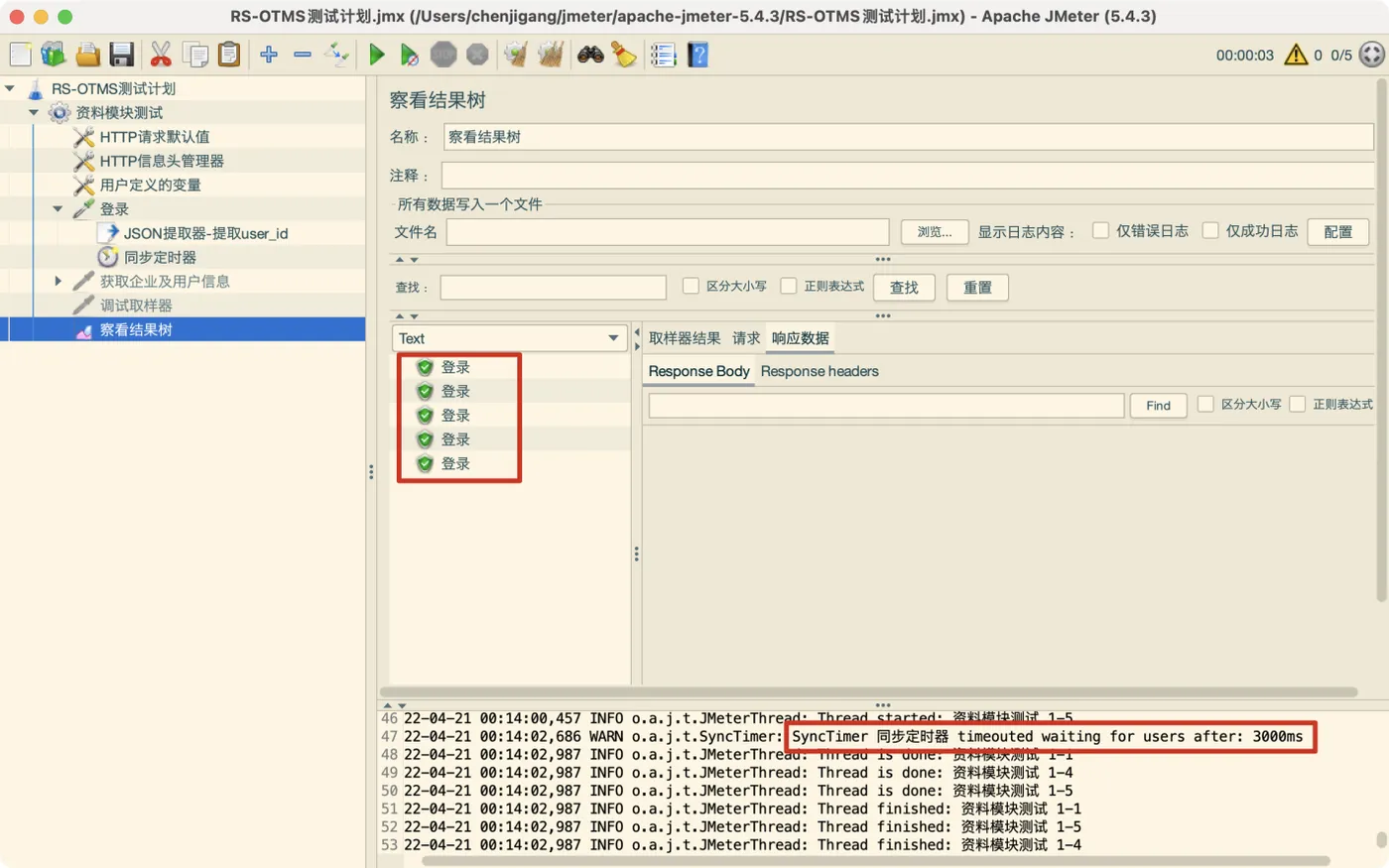 由于设置的模拟用户数量为8,即集合点数量为8,而线程组的总用户数只有5,因此达不到集合点数量要求,但是设置了超时时间为3秒,所以Jmeter会在3秒后,同时发起5个(用户)请求,如下图所示: