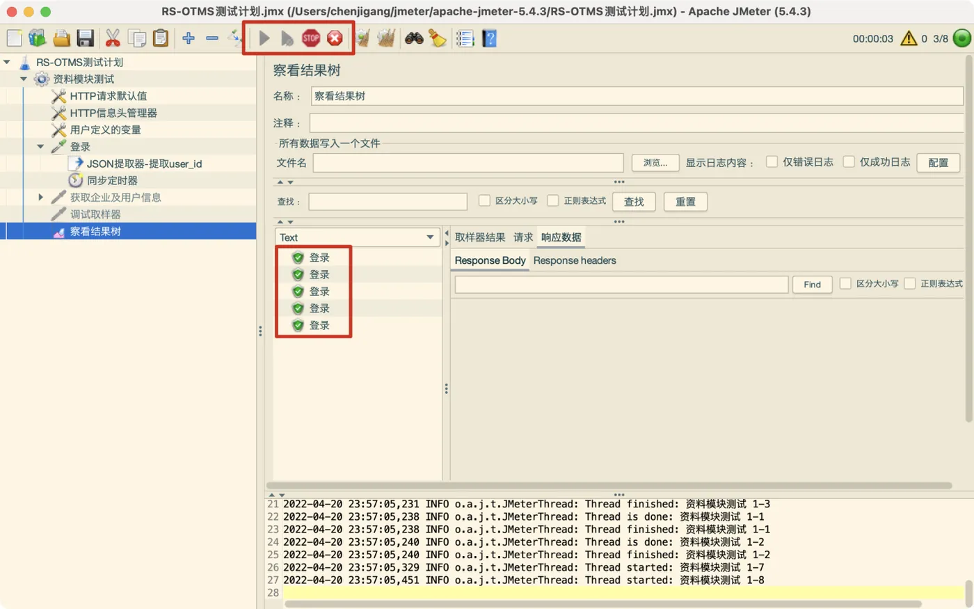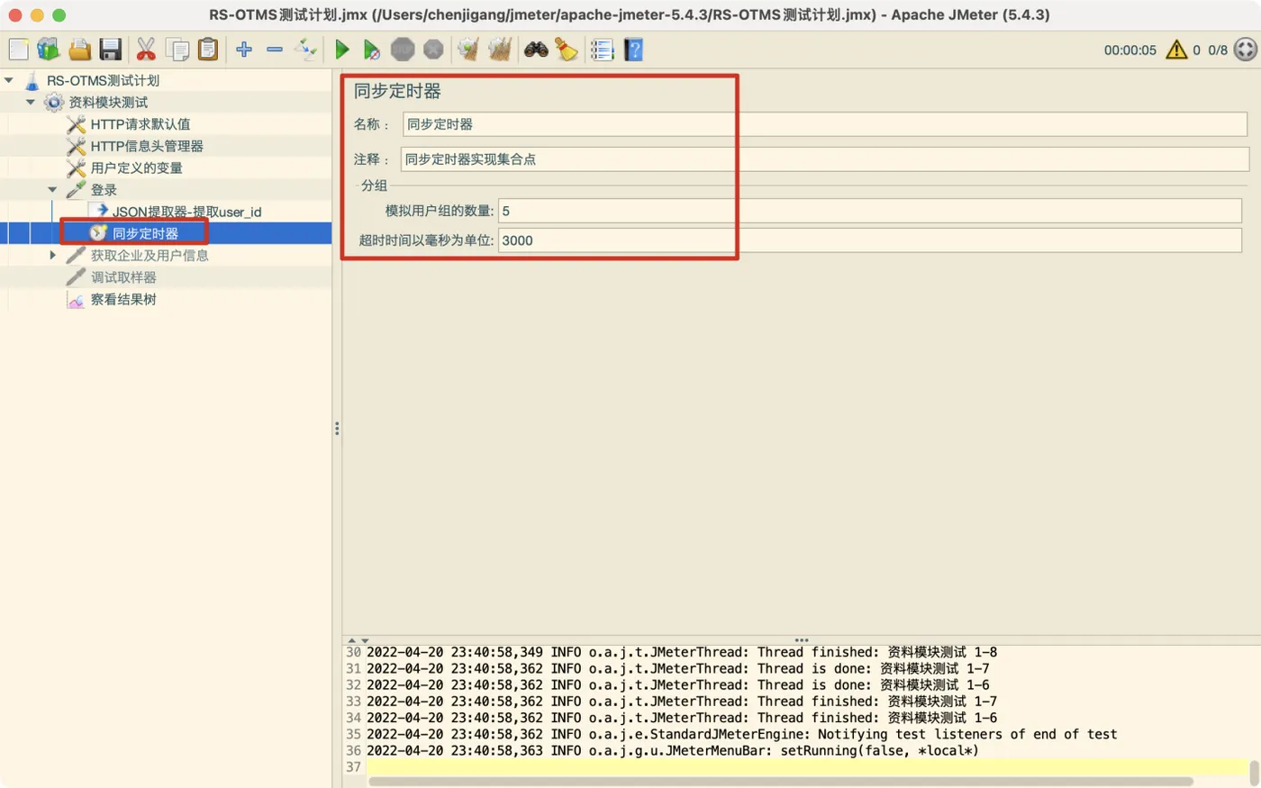 例如:模拟用户为5,线程数量为8,那么在运行Jmeter后,Jmeter会先同时发起5个请求,剩下3个用户不足集合点的数量5,由于又没有设置超时时间,因此达不到集合点的数量要求,Jmeter就会一直处于等待状态;