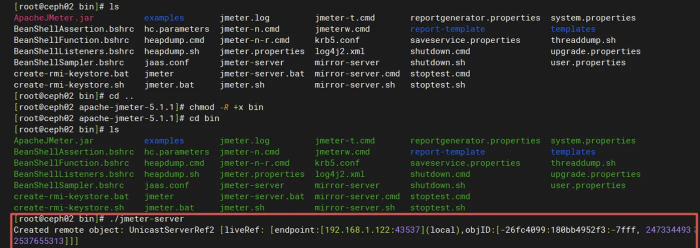 chmod-R+x bin # jmeter-server、jmeter文件都需要执行权限,可以简单粗暴使用chmod -R参数赋予整个bin目录执行权限 ./jmeter-server # 启动jmeter-server服务