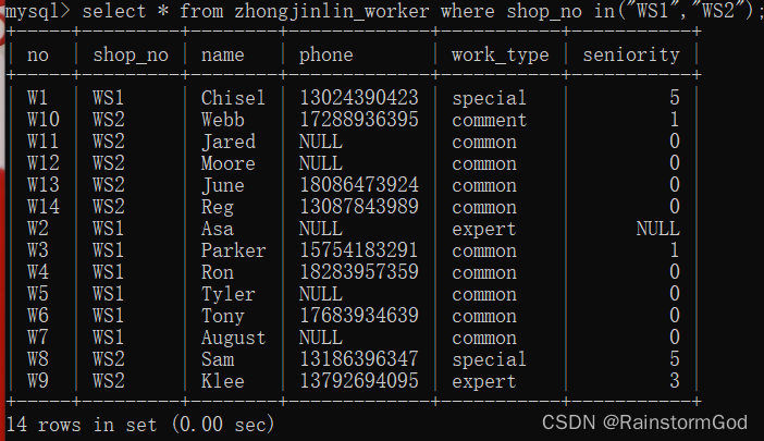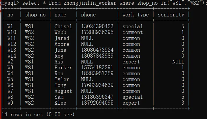 select * from zhongjinlin_worker where shop_no in("WS1","WS2");