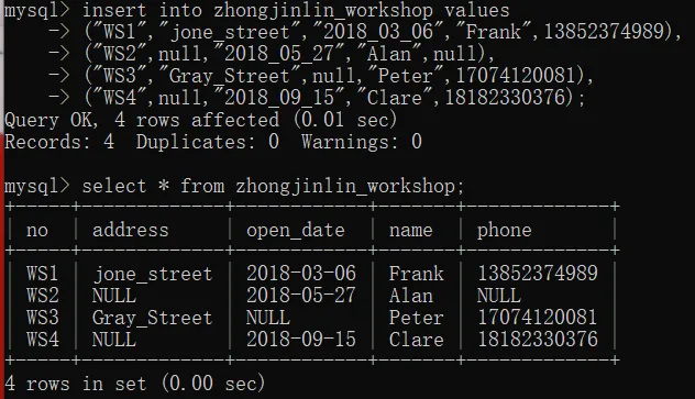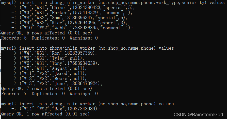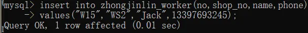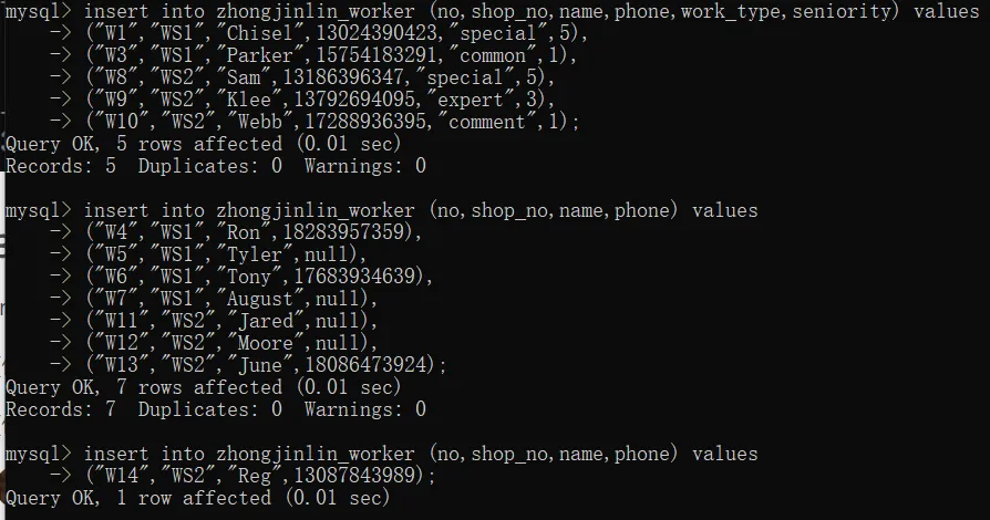 insert into zhongjinlin_worker(no,shop_no,name,phone)