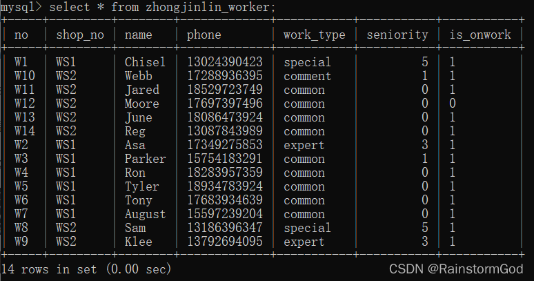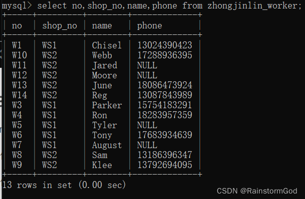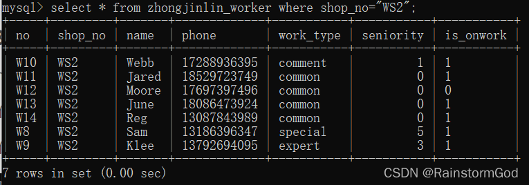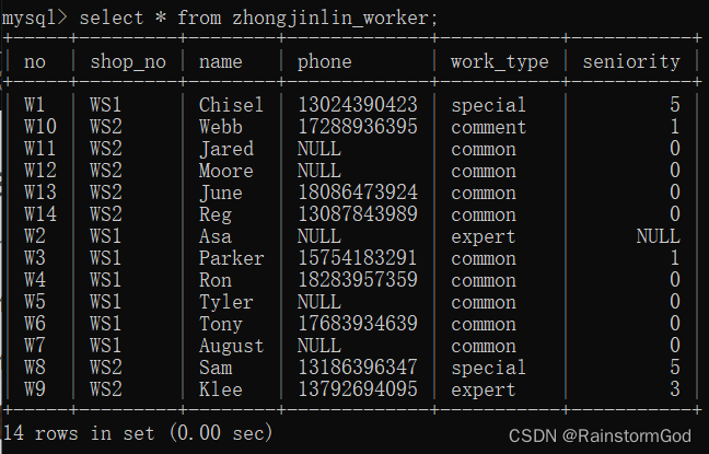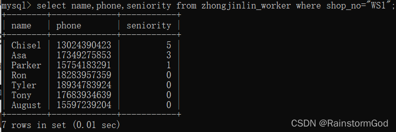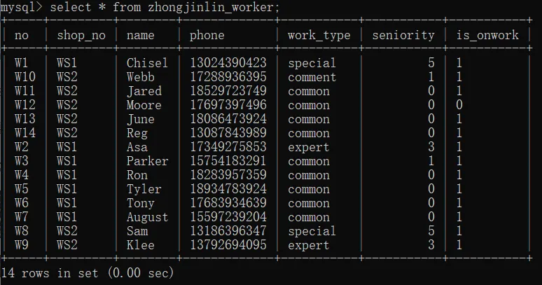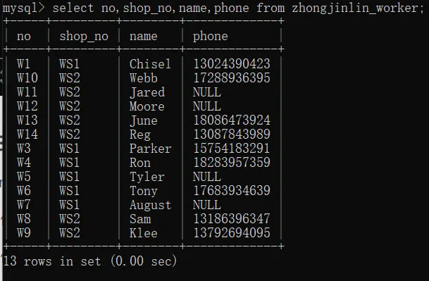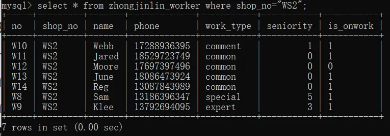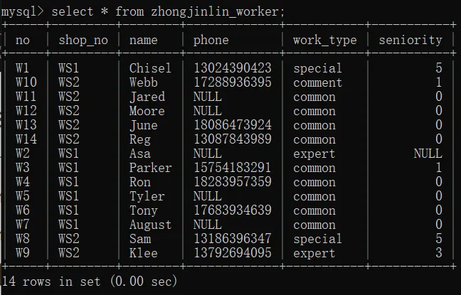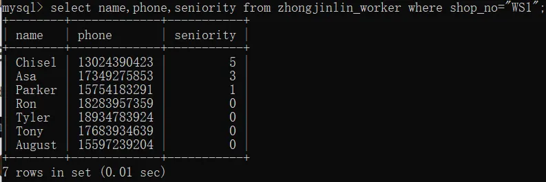 select name,phone,seniority from zhongjinlin_worker where shop_no="WS1";