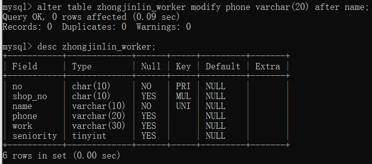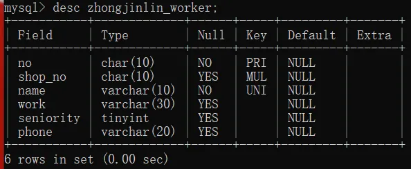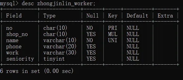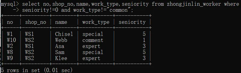 select no,shop_no,name,work_type,seniority from zhongjinlin_worker where