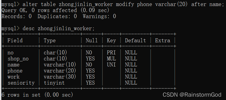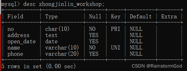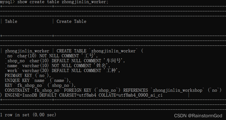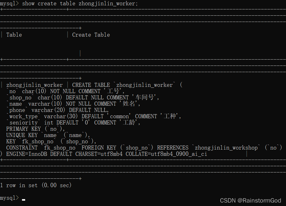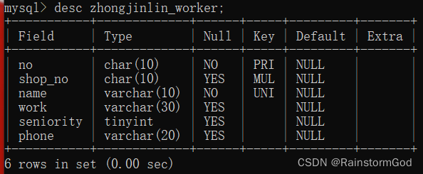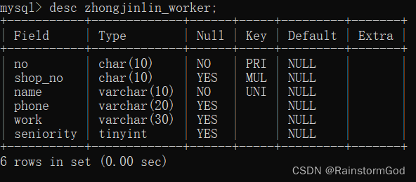 -> no char(10) comment "工号" primary key,