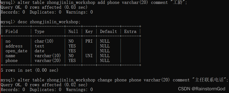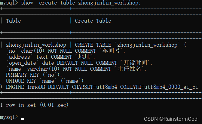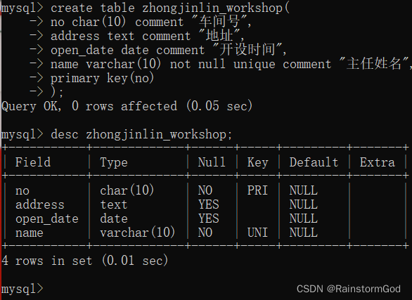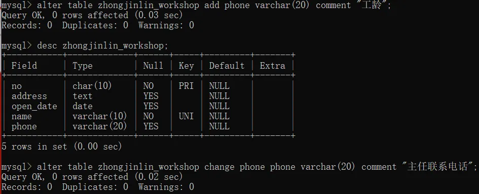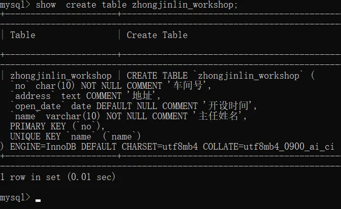 -> name varchar(10) not null unique comment "姓名",