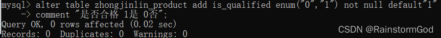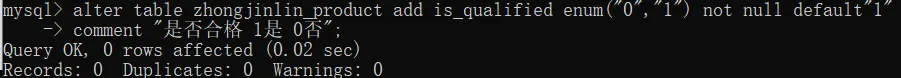 alter table zhongjinlin_product add is_qualified enum("0","1") not null default"1"