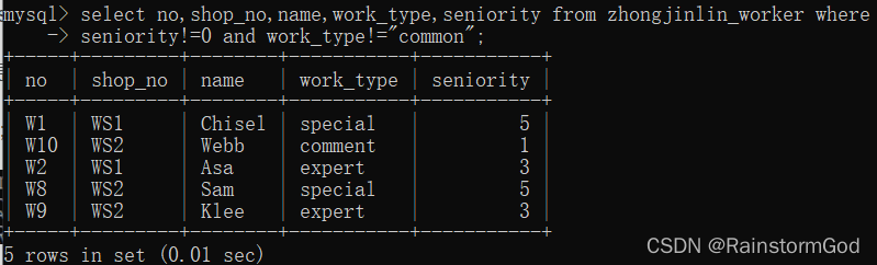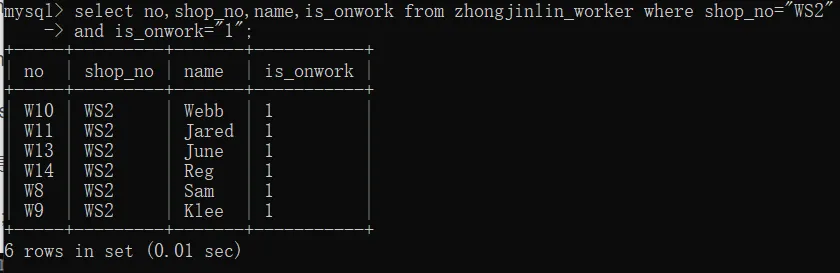 select no,shop_no,name,is_onwork from zhongjinlin_worker where shop_no="WS2"