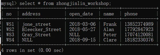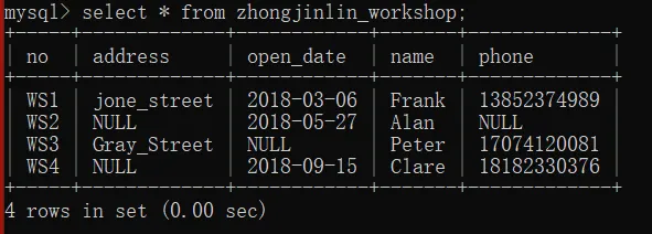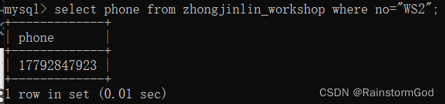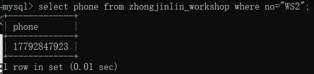 select phone from zhongjinlin_workshop where no="WS2";
