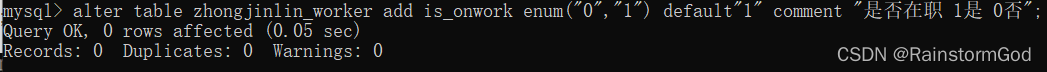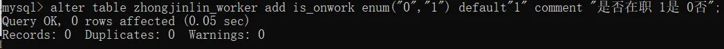 alter table zhongjinlin_worker add is_onwork enum("0","1") default"1" comment "是否在职 1是 0否";