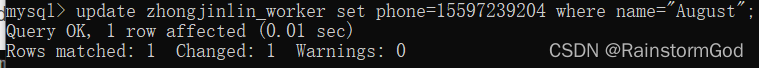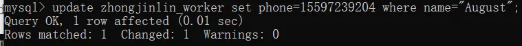update zhongjinlin_worker set phone=15597239204 where name="August";