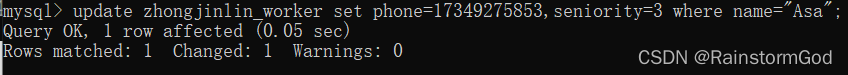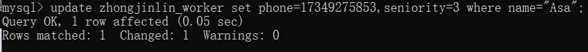 update zhongjinlin_worker set phone=17349275853,seniority=3 where name="Asa";