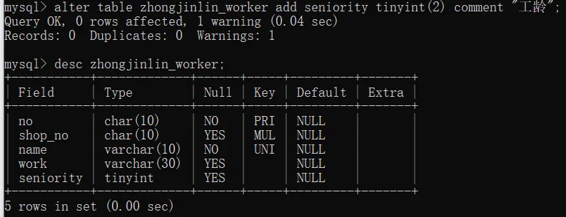 你看到工种、工龄、是否在职都与表中设置的默认值相同,故使用指定字段添加数据的方式插入了这条数据,只指定了工号、车间号、职工姓名、联系方式字段