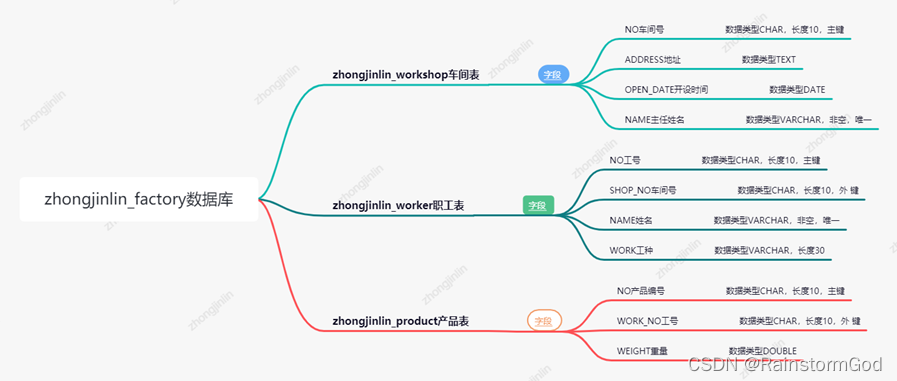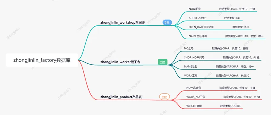 他们看到你的展示后更坚信要你来完成工厂数据库创建,你就数据库创建所需内容和大家讨论,讨论结果是需要创建车间、职工、产品三张表,会后你