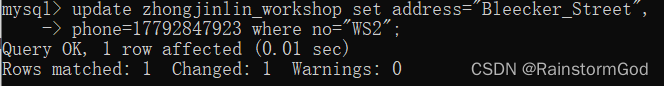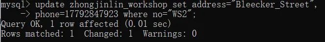 此时秘书打来电话说WS2车间的地址在Bleecker Street,主任的联系方式是17792847923,你修改了车间表中WS2车间的地址和主任联系方式