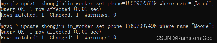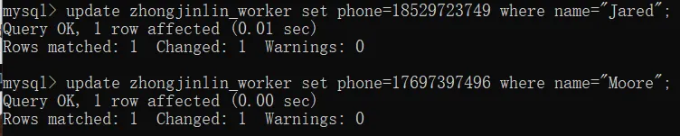 打电话给WS2车间主任,得知Jared和Moore的联系方式分别是18529723749和17697397496,你写了两条update语句来改这两条数据