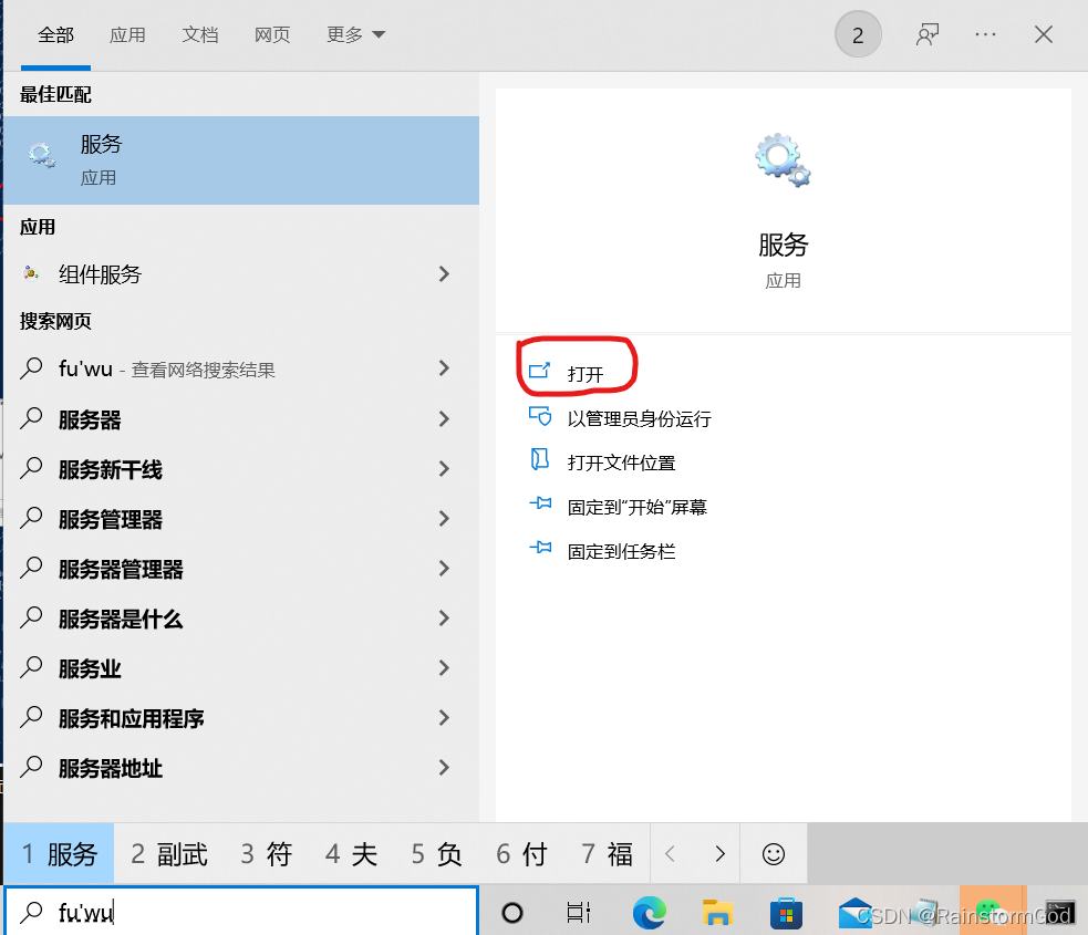 当使用net start mysql命令开启mysql的服务失败时,可能是服务器无法连接启动,这时可以手动启动,在系统搜索栏搜索“服务”