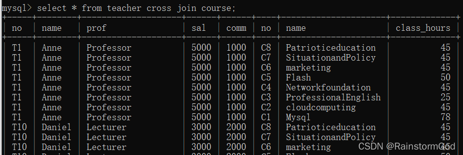 select * from 表名1 cross join 表名2;