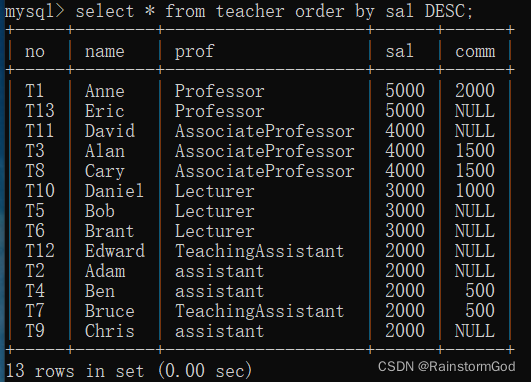 select * from 表名 order by 字段名 DESC;(倒序)