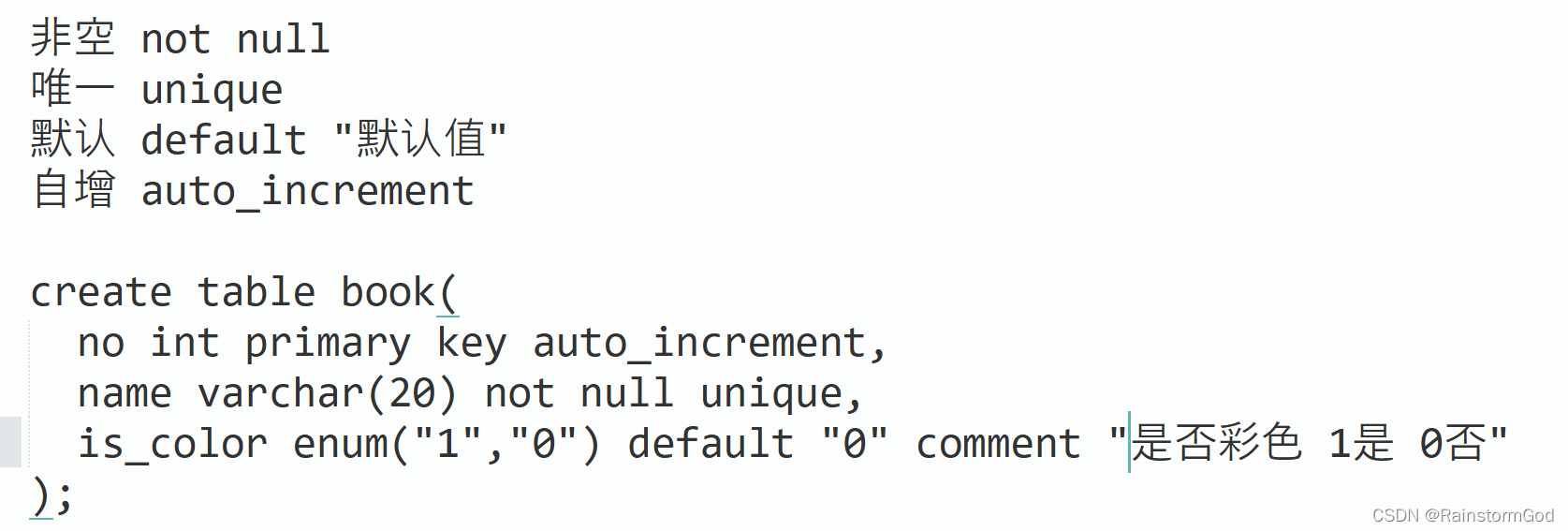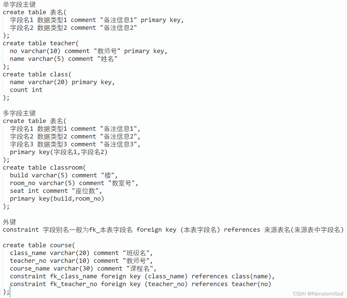 字段名1 字段数据类型1 comment “备注信息” primary key,