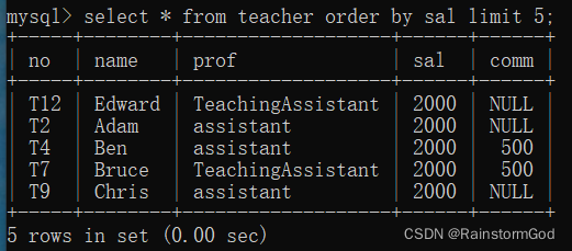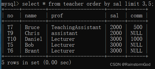 select * from 表名 order by 字段名limit偏移量,条数;