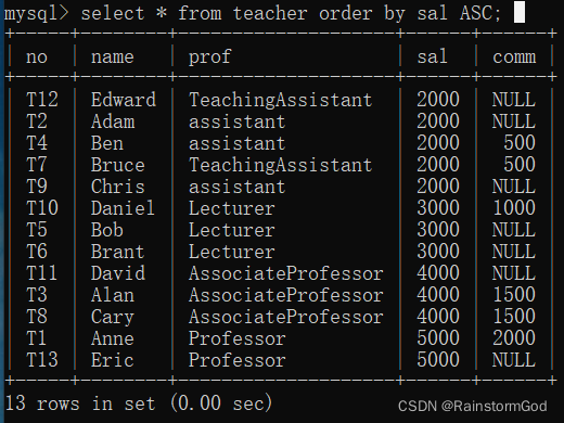 select * from 表名 order by 字段名ASC;(默认正序)