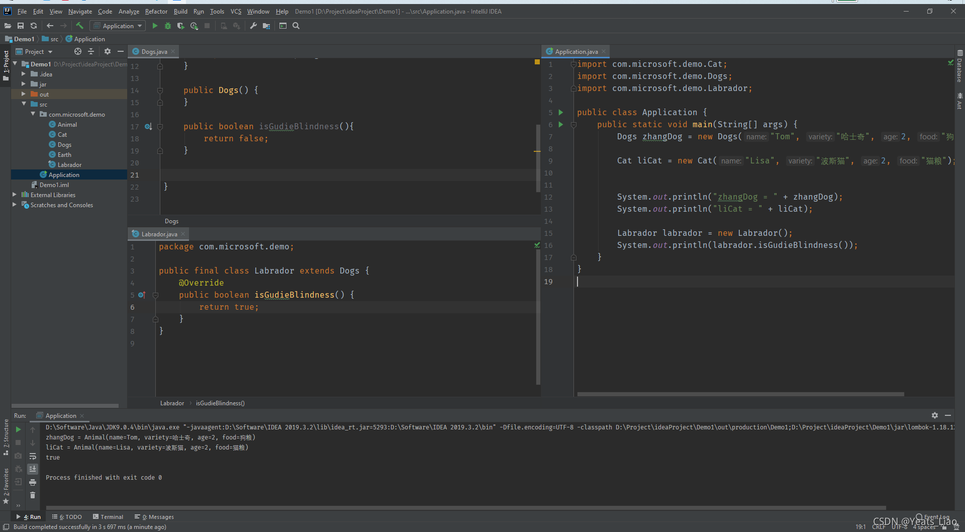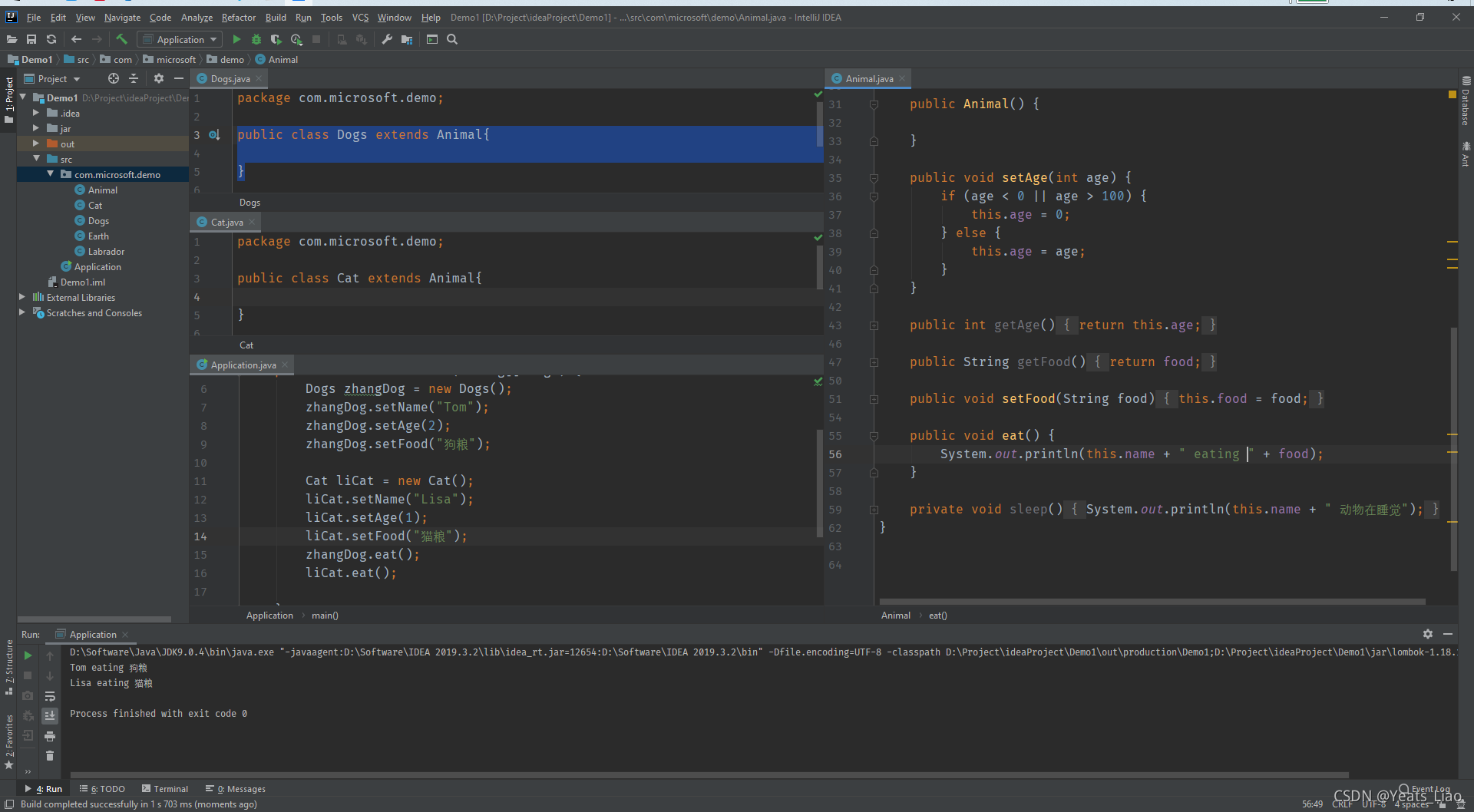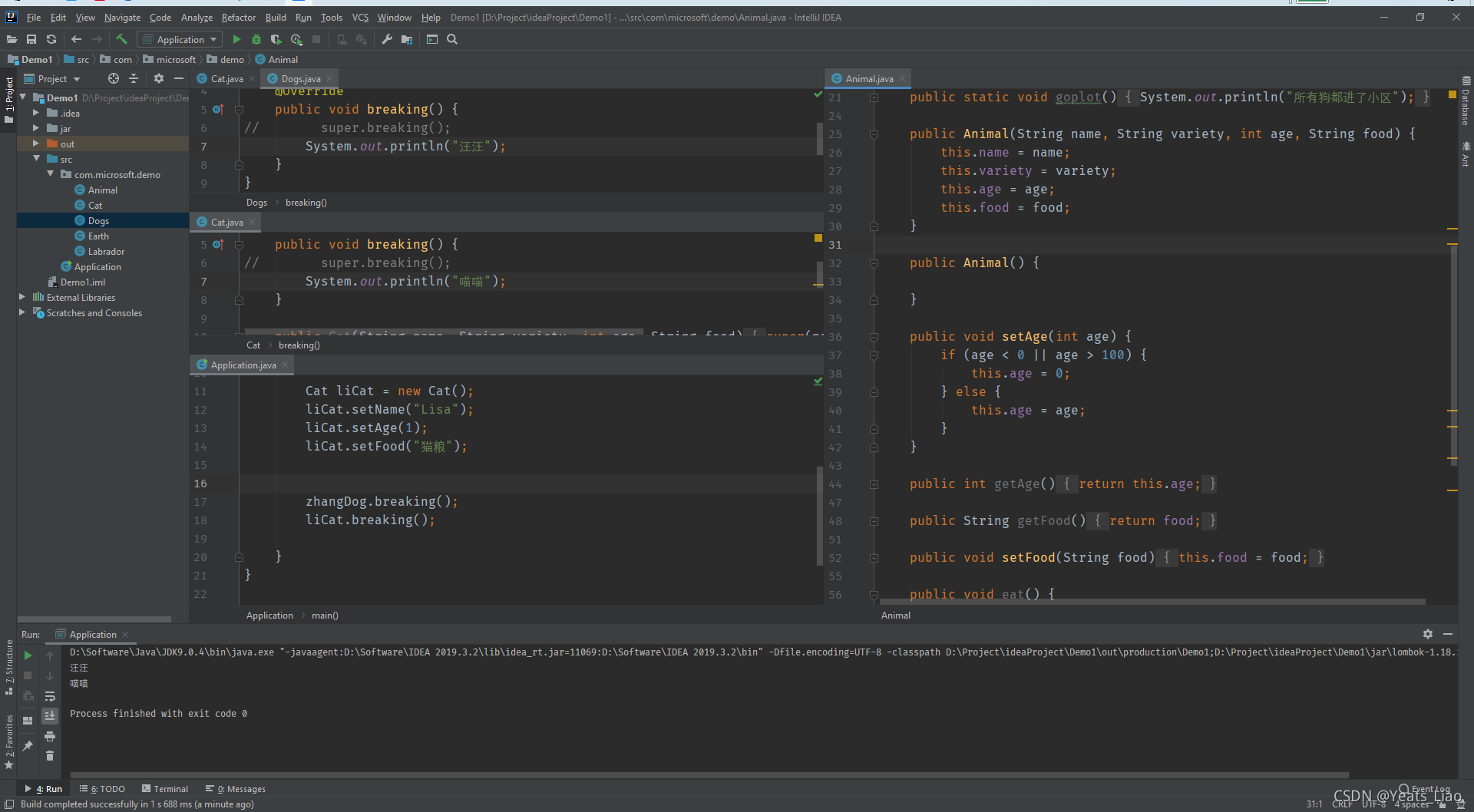 我们把原来属于Dogs的内容转移到了Animal中,使用 extends ,最后在主函数中像之前一样Dogs类