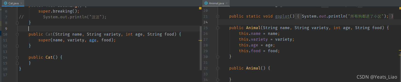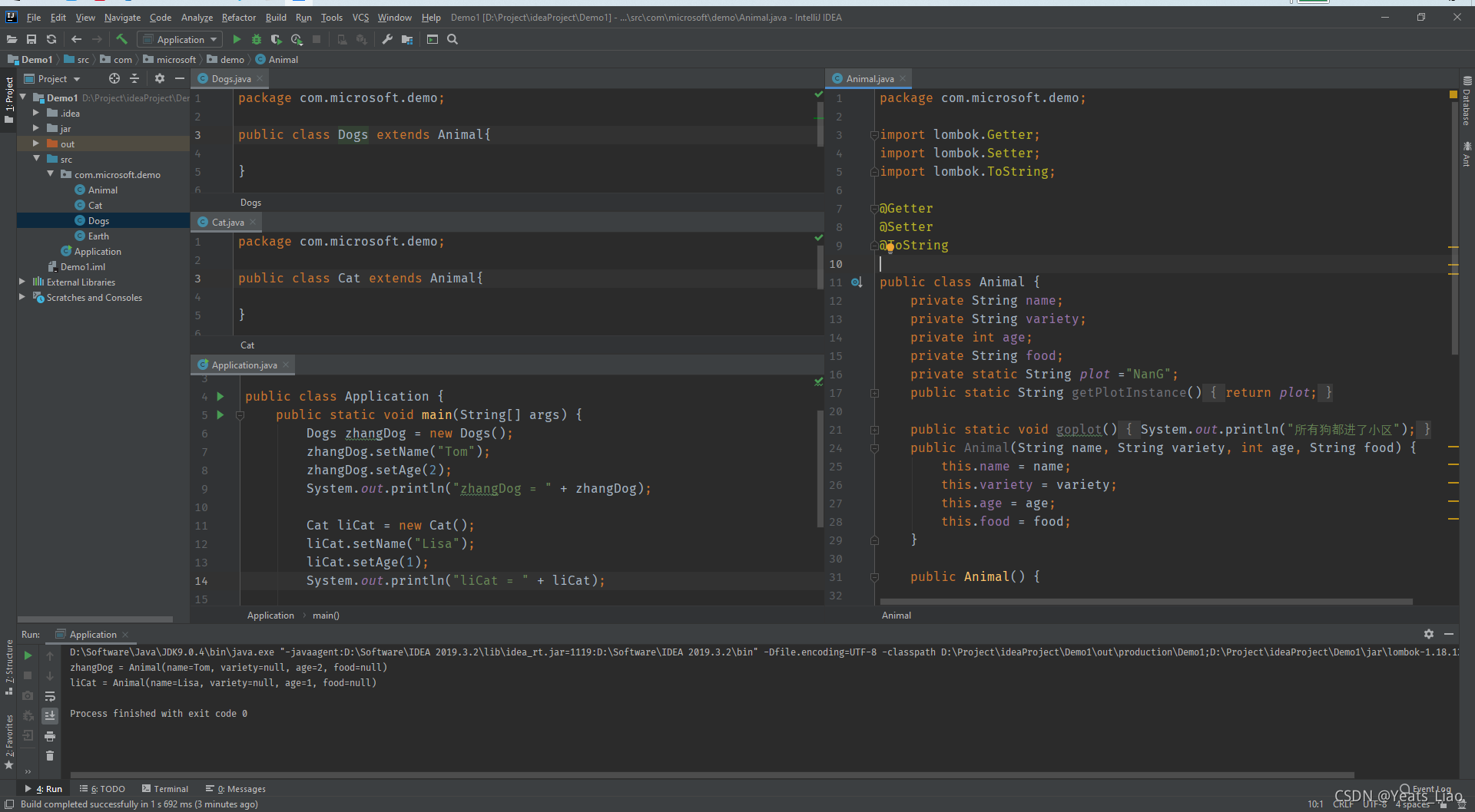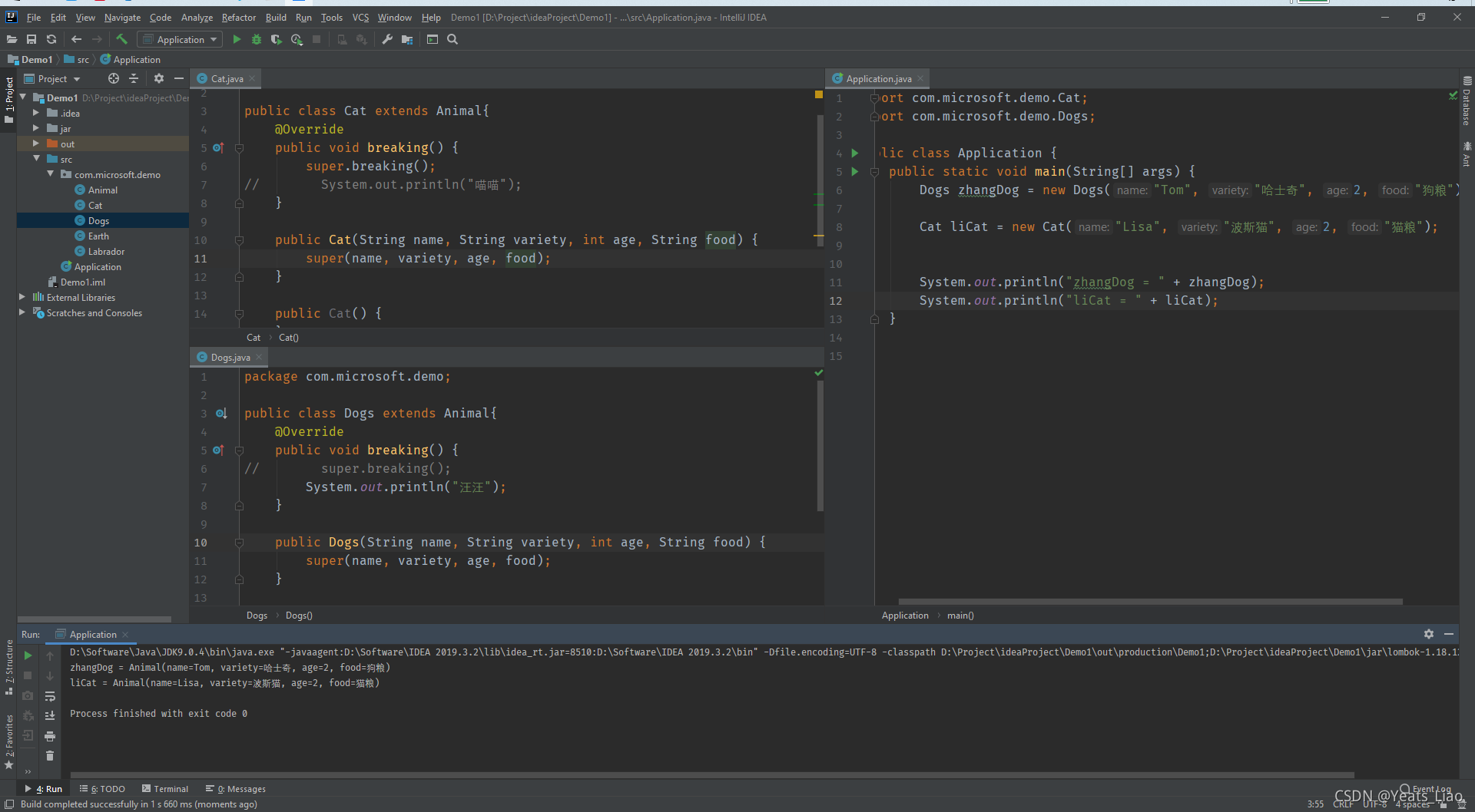 我们把原来属于Dogs的内容转移到了Animal中,使用 extends ,最后在主函数中像之前一样Dogs类