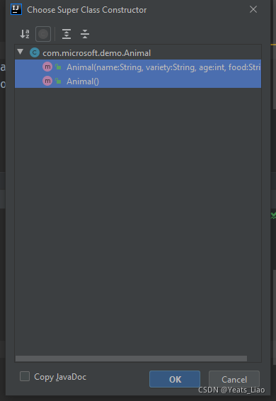 public Dogs(String name, String variety, int age, String food) { super(name, variety, age, food); } public Dogs() { } }