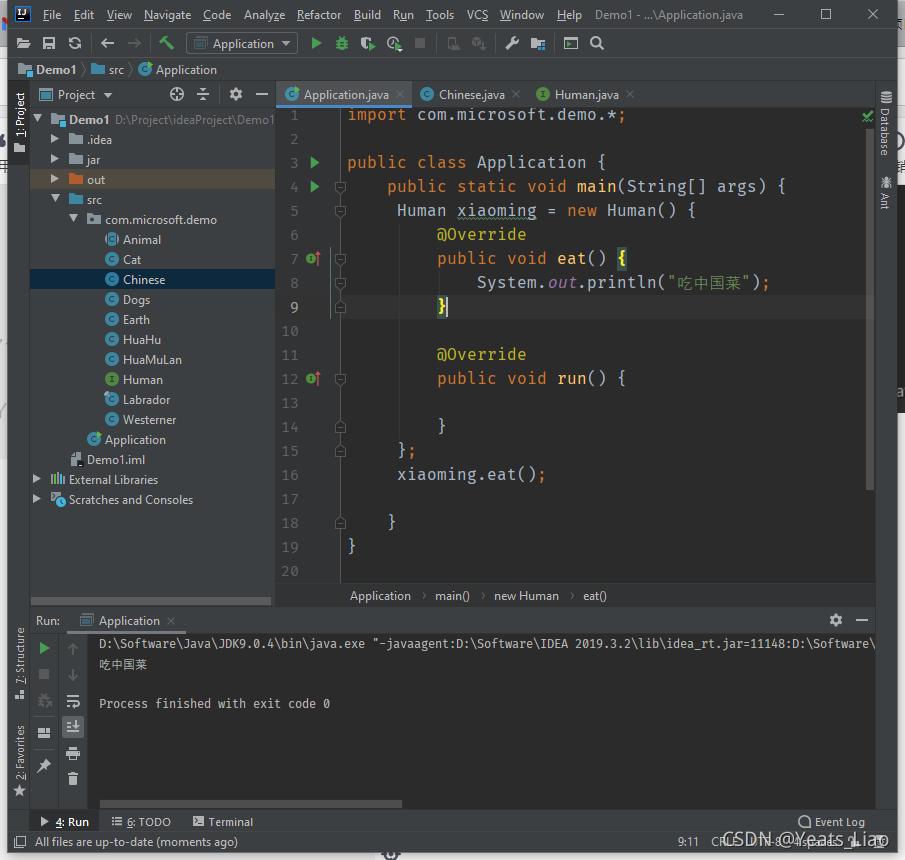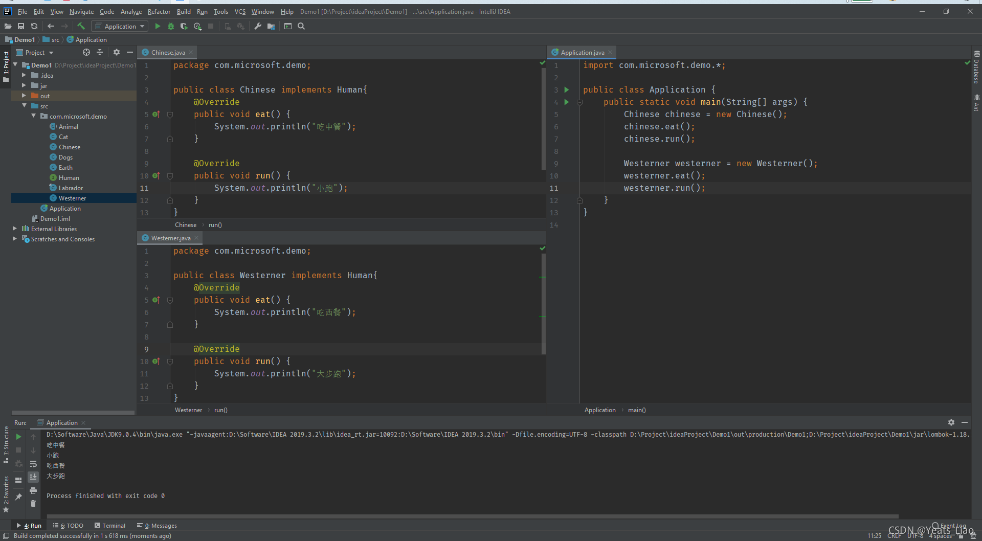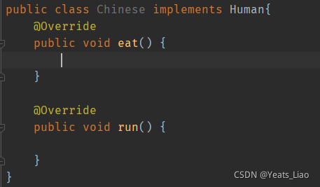 public class Chinese implements Human{ @Override public void eat() { System.out.println("吃中餐"); } @Override public void run() { System.out.println("小跑"); } }