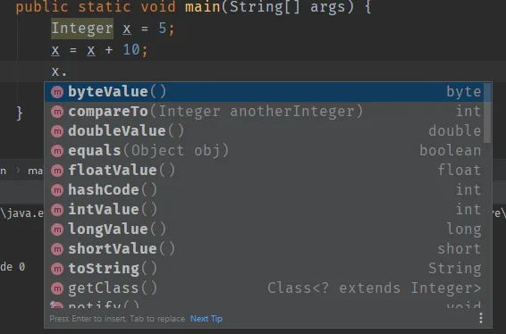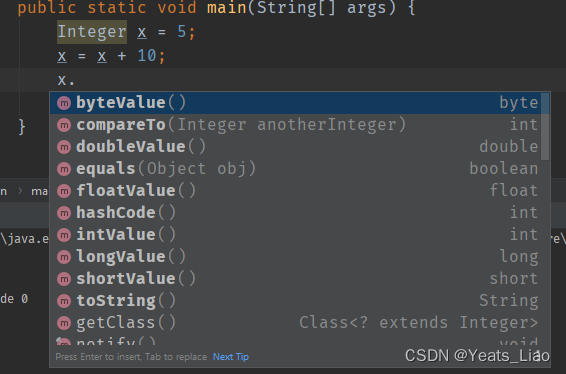 public class Main { public static void main(String[] args) { Integer x = 5;//x装箱,拿来赋值 x = x + 10;//x拆箱,拿出来用 System.out.println(x); } }