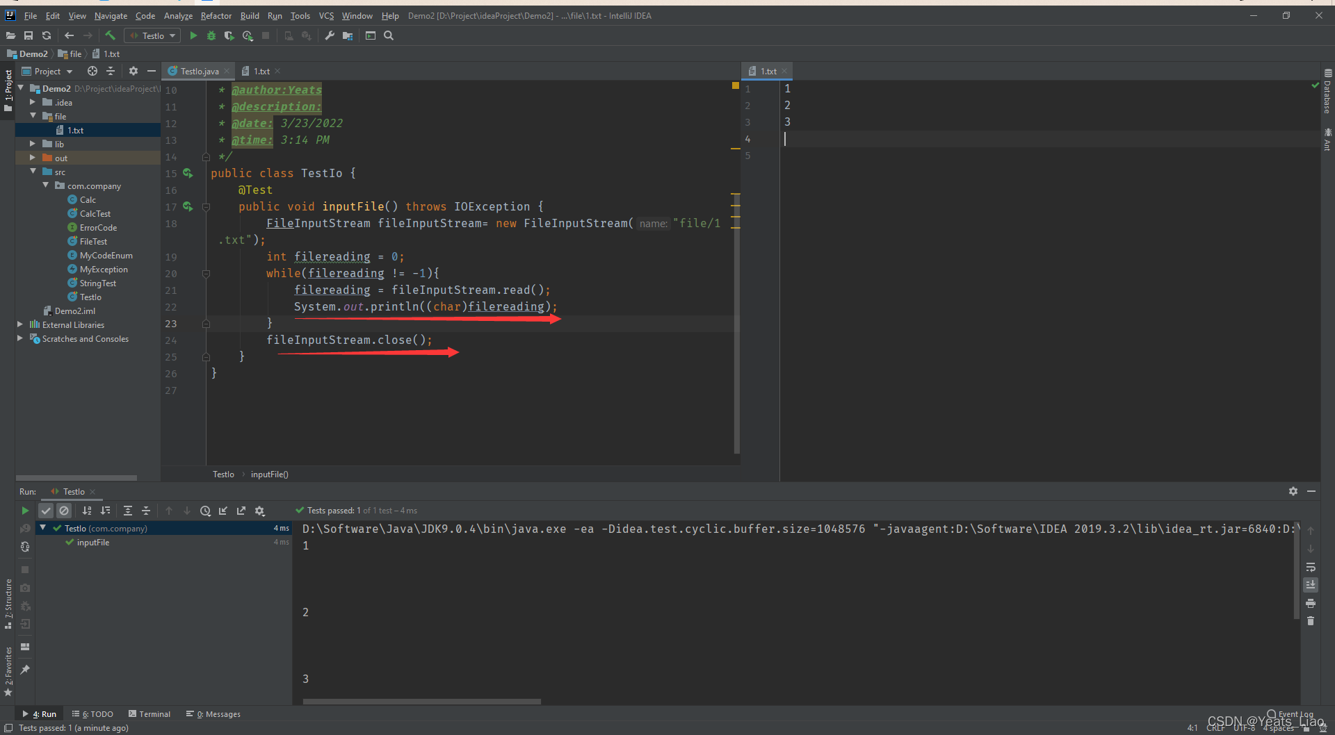 在file文件夹下创建1.txt文件,随便写入一点东西,.read()方法是按照字节的二进制形式一个一个读取的,如果不想看到ASCII码,就需要将它转换成(char)类型,在代码的末尾要加上.close() 关闭程序