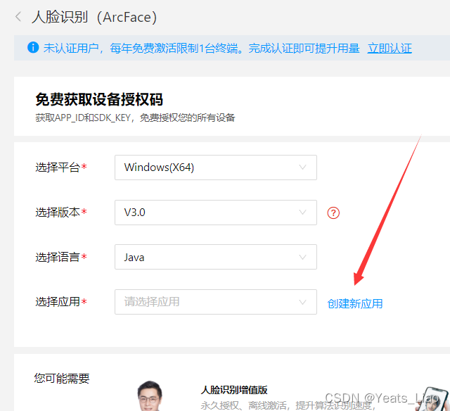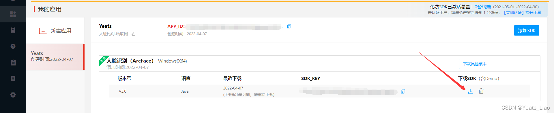 注册并使命认证后,选择免费SDK,人脸识别(ArcFace)