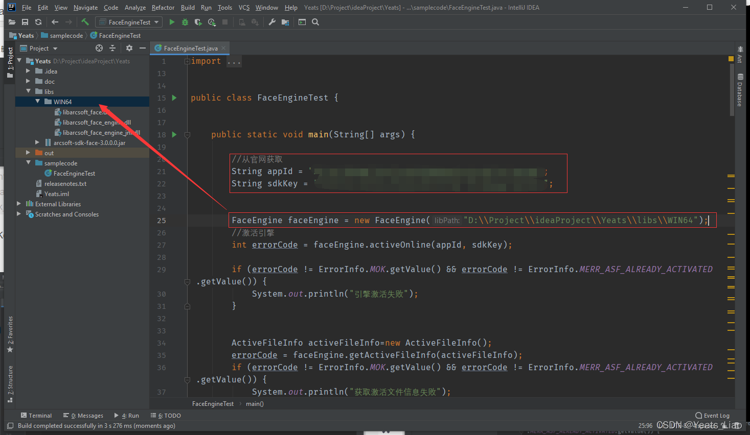 从官网获取appId和sdkKey,将libs文件路径设置好
