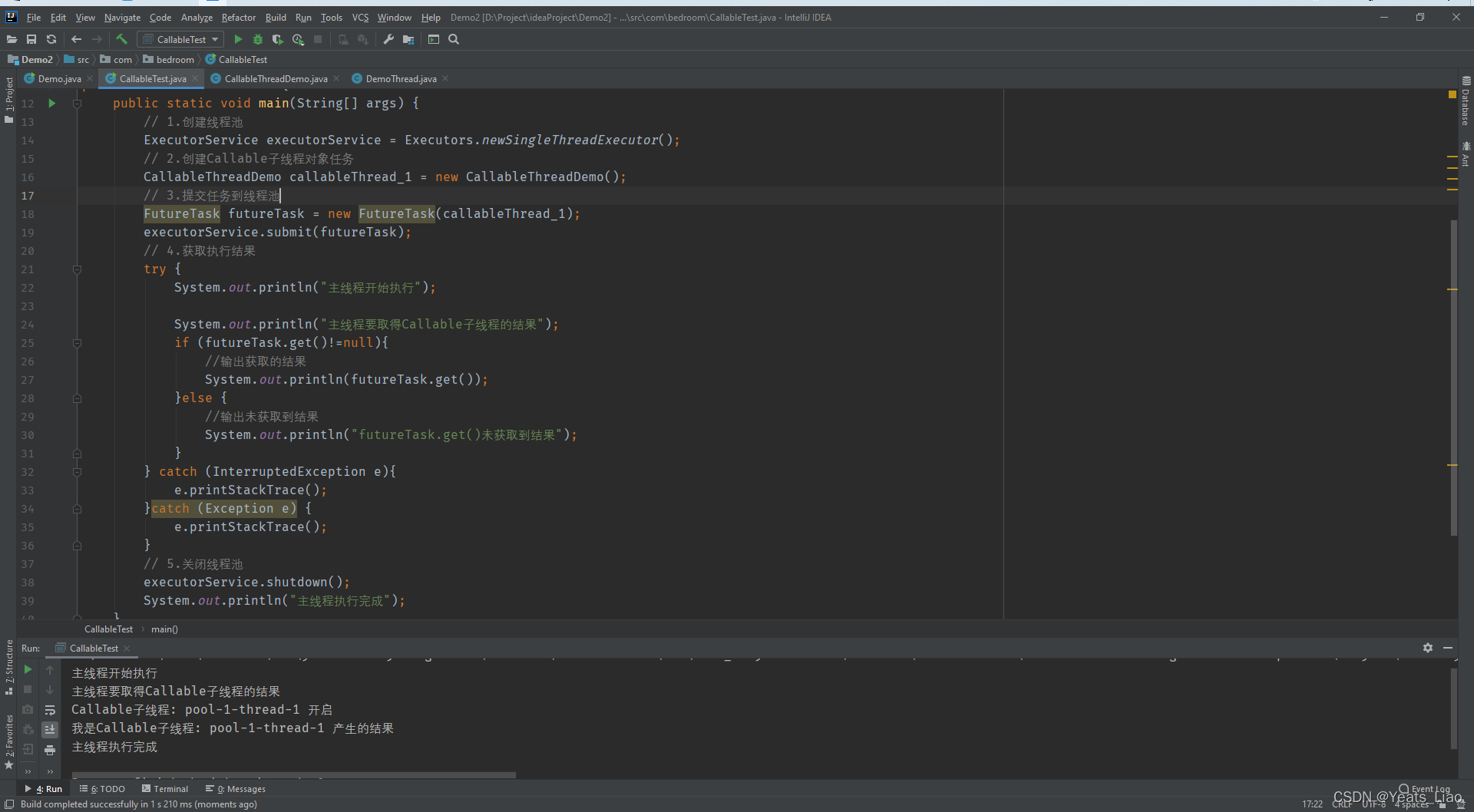 public class CallableTest { public static void main(String[] args) { // 1.创建线程池 ExecutorService executorService = Executors.newSingleThreadExecutor(); // 2.创建Callable子线程对象任务 CallableThreadDemo callableThread_1 = new CallableThreadDemo(); // 3.提交任务到线程池 Future future = executorService.submit(callableThread_1); // 4.获取执行结果 try { System.out.println("主线程开始执行"); System.out.println("主线程要取得Callable子线程的结果"); if (future.get()!=null){ //输出获取的结果 System.out.println(future.get()); }else { //输出未获取到结果 System.out.println("future.get()未获取到结果"); } } catch (InterruptedException e){ e.printStackTrace(); }catch (Exception e) { e.printStackTrace(); } // 5.关闭线程池 executorService.shutdown(); System.out.println("主线程执行完成"); } }