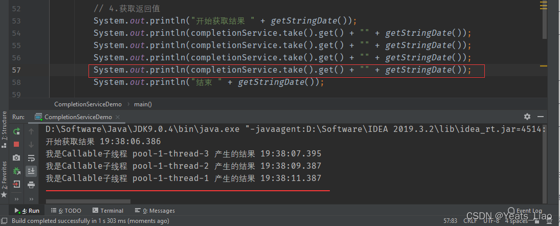 public class CompletionServiceDemo { public static void main(String[] args) throws ExecutionException, InterruptedException { // 1.创建线程池 ExecutorService executorService = Executors.newFixedThreadPool(5); // 2.创建一个ExecutorCompletionService放入线程池实现CompletionService接口 CompletionService completionService = new ExecutorCompletionService(executorService); // 3.创建Callable子线程对象任务 Callable callable_1 = new Callable() { @Override public String call() throws Exception { Thread.sleep(5000); return ("我是Callable子线程 " +Thread.currentThread().getName()+ " 产生的结果 " ); } }; Callable callable_2 = new Callable() { @Override public String call() throws Exception { Thread.sleep(3000); return ("我是Callable子线程 " +Thread.currentThread().getName()+ " 产生的结果 " ); } }; Callable callable_3 = new Callable() { @Override public String call() throws Exception { Thread.sleep(1000); return ("我是Callable子线程 " +Thread.currentThread().getName()+ " 产生的结果 " ); } }; // 3.使用CompletionService提交三个任务到线程池 completionService.submit(callable_1); completionService.submit(callable_2); completionService.submit(callable_3); // 4.获取返回值 System.out.println("开始获取结果 " + getStringDate()); System.out.println(completionService.take().get() + "" + getStringDate()); System.out.println(completionService.take().get() + "" + getStringDate()); System.out.println(completionService.take().get() + "" + getStringDate()); System.out.println("结束 " + getStringDate()); // 5.关闭线程池 executorService.shutdown(); } // 获取时间函数 public static String getStringDate() { Date currentTime = new Date(); SimpleDateFormat simpleDateFormat = new SimpleDateFormat("HH:mm:ss.SSS"); String date = simpleDateFormat.format(currentTime); return date; } }