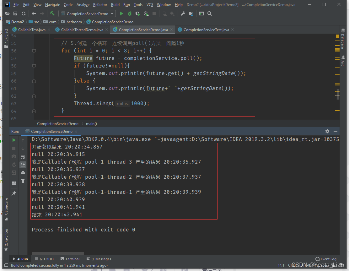 创建CompletionServiceDemo类,创建好的线程对象,使用Executors工厂类来创建ExecutorService的实例(即线程池),通过ThreadPoolExecutor的.submit()方法提交到线程池去执行,线程执行后,返回值Future可被拿到